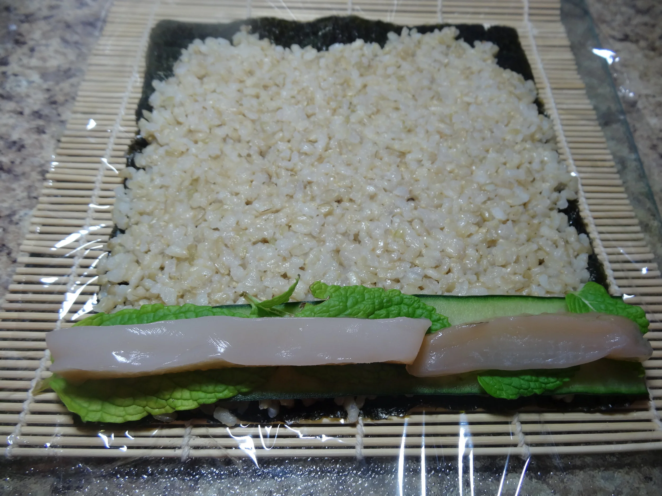 3. Add a slice of cucumber & mint across the bottom edge of the sushi. Place small slices of your SCOBY over the other ingredients at the bottom.