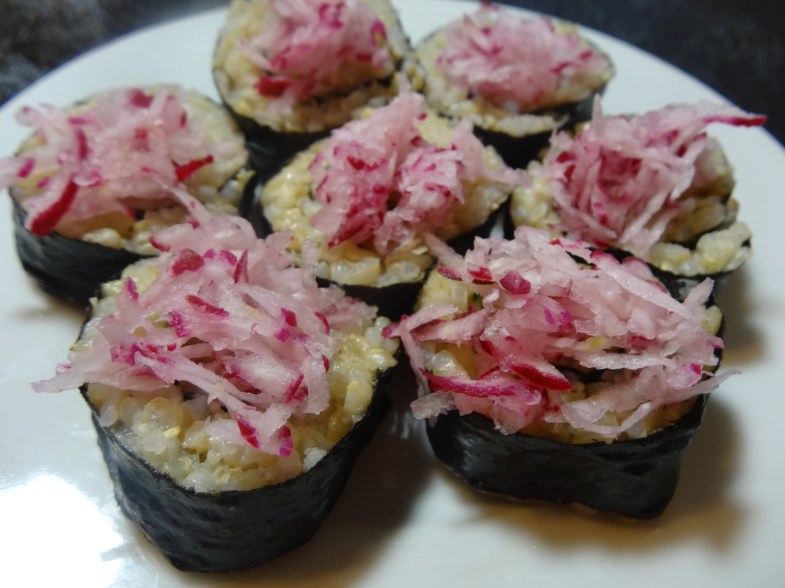 5. Let the sushi sit for a few minutes before slicing. Sprinkle kelp powder & cayenne on top of sliced sushi and top with grated radishes if desired.